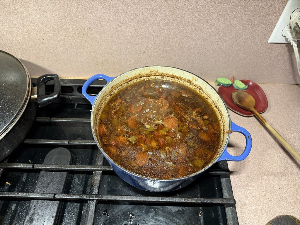 My decision to make gumbo was a mix of trying something new and my desire to use the leftover chicken in the refrigerator and the half-pack of kielbasa in the freezer. I have made variations of this dish before, but this is the first time I started from a roux. Being a creature of habit, I only partially followed the recipe. I started by baking the flour in the oven at 350F (177.6C) for 45 minutes for the darkened color and to add a toasty flavor to the roux. While the flour was baking, I got restless and went ahead and sautéed the cut-up chicken and sausage as well as the trinity (different pans). The roux itself was a mix of vegetable oil (olive) and toasted flour that was cooked down on low heat for 35 minutes. Since the vegetables had already softened, I placed them in the pot along with a can of Rotel tomatoes and chilies, Cajun spices, cayenne pepper, and six cups of chicken broth. Next came the chicken and sausage and a Bay leaf for flavor. The on-line recipe suggested letting the gumbo simmer for “1 to 2 hours” rather than the noted minimum of three. I put the finished ingredients on around 4 pm and we will not eat until after 7. That should give the flavors enough time to meld.