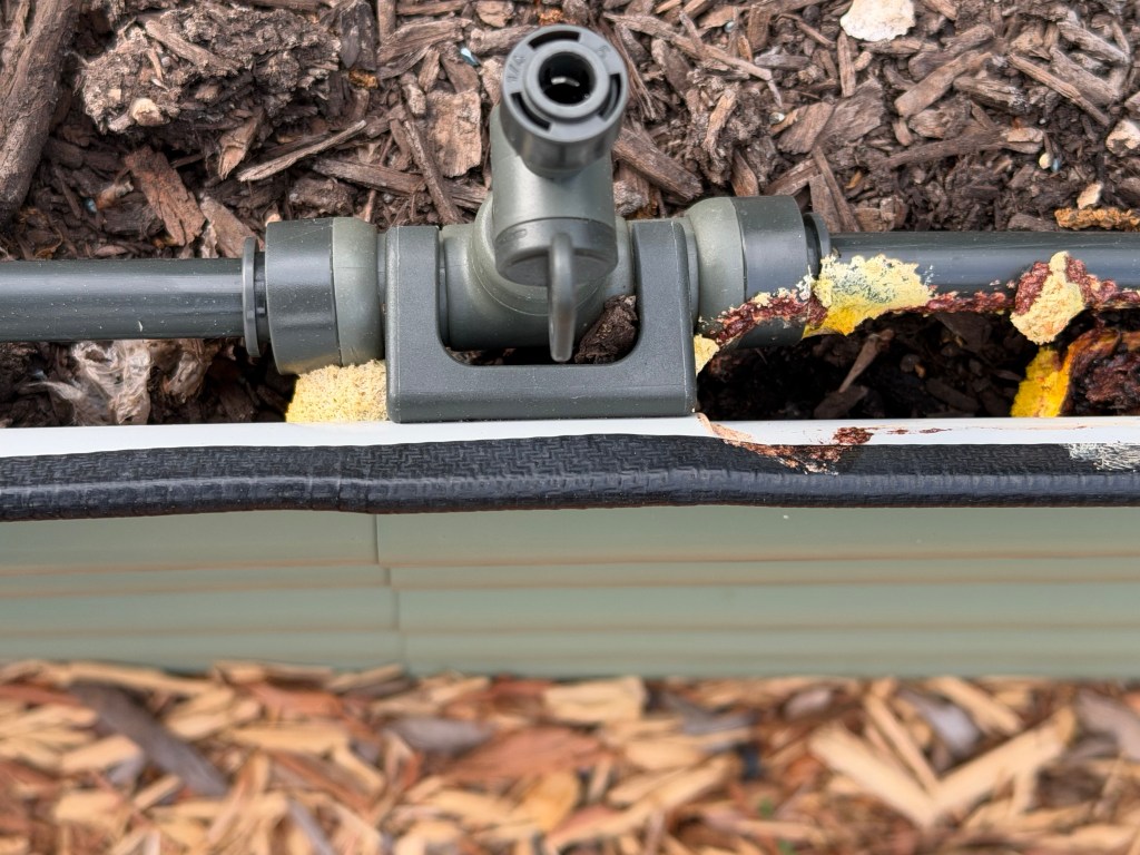 Today was time for a second planting of several vegetables in the raised beds. The seed package suggested I plant my peas (Pisum sativum) with a second planting two weeks later to ensure I had a continued harvest later during the season. I thought this was a good idea for my cabbage (Brassica oleracea) and cauliflower (Brassica oleracea var. botrytis) as well. It was also time to plant the artichoke (Cynara cardunculus var. scolymus) seeds I had placed in the refrigerator (scored) two weeks ago to prepare them for planting. Scoring is done to “trick” the seeds into thinking they are coming out of Winter and into Spring. While I was placing the new seeds in the ground I found most of the seeds I had planted had yet to sprout, except for my radishes (Raphanus sativus). Something should have sprouted in all these seeds. After planting the new seeds, I watered the raised beds to keep all the unsprouted seed moist. Then I noticed several spots of bright yellow blobs clinging to the watering hoses in one of the beds. This appeared to be a form of slime mold.