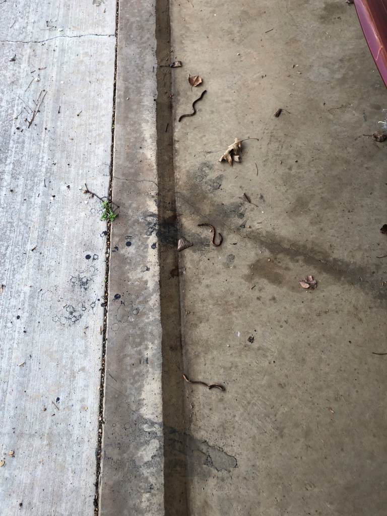 Why they get lost on the surface is less clear. Once they get out on the surface, they seem to become confused and cannot find their burrows after they dry out. They move around trying to find safety, but those who wander onto the concrete driveways or gutters have no way to go back into the ground. As the sun begins warming the concrete and the water dissipates, the worms dry out and die. The three worms I found yesterday had taken refuge under my garage door. Two appeared to have succumbed and dried out but one was still alive and wiggling. I threw them all back in the yard, just in case.