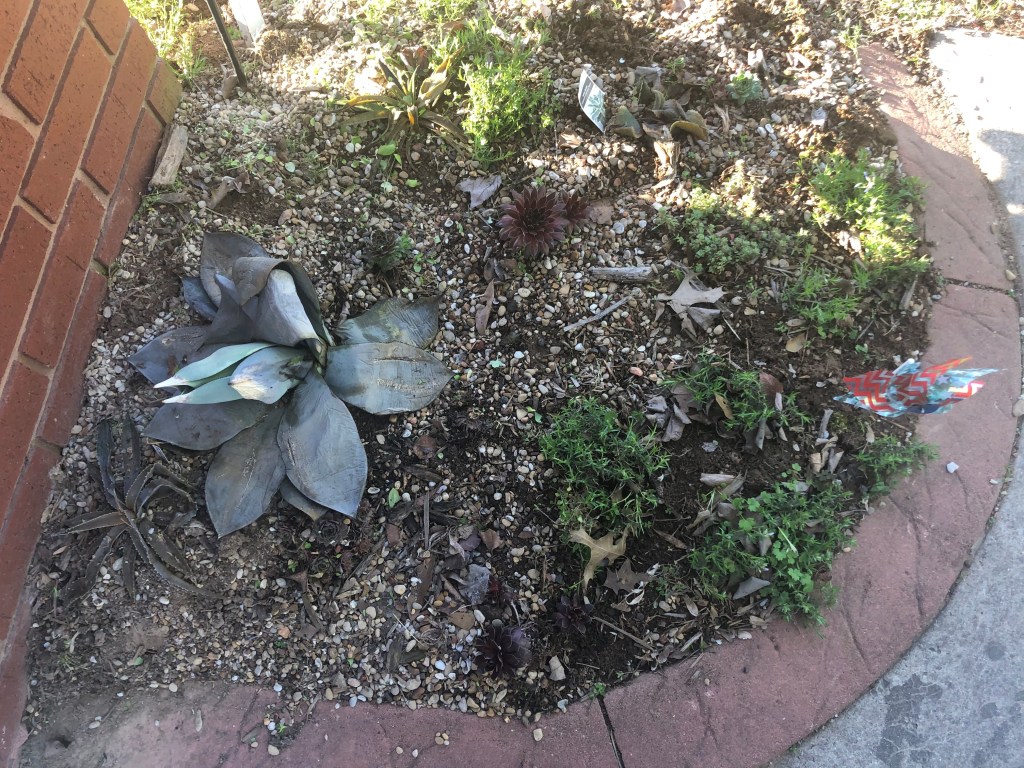 Removing the rest of the mesh from the front bed would have taken more time than I was willing to spend last night. I decided instead to take on the smaller beds on either side of the garage and the bed under the front pear tree. When I removed the mesh the first thing it revealed was the weeds that were flourishing in their protected environment. As I weeded all three beds the same pattern was reveled in each. All the small ground hugging varieties had not only survived but sprouted shoots with new babies on the ends. The Agave had not fared so well. These were taller to begin with and generally had the mesh resting on the plant. Most had succumbed to the cold and the plants had turned mushy. When Melissa saw them, she removed them immediately so they would not attract disease and infect the other plants.