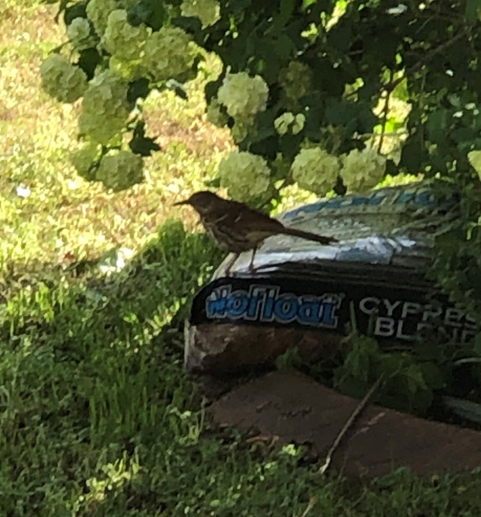 Several weeks ago, I mentioned the competition between the Mockingbird and Cardinal over the Snowball Bush in our front yard. The Cardinal seems to have given up but now there is new competition. I have noticed a medium sized brown bird flitting in the bush or along the ground nearby as I come into the driveway. It took a while to finally get a photo of the Mockingbird and the same is true with this elusive bird. I would drive in and he would take off, or I would reach for my camera and he was gone. Today I saw him near the bush and happened to have my phone in my pocket. I snapped him from inside the house as he rummaged for insects on the ground.