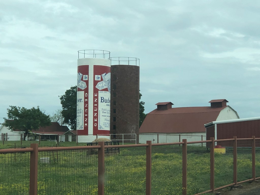 The silo I passed Saturday was located on a ranch that raised Certified Angus Beef. They used this upright silo to store grain they used to feed the cattle during the lean winter months. It seems the original owner was also the local beer distributor. He had painted the Budweiser logo replica on the silo years ago, but it had faded over time. After he died, his daughters ran the beer distributor business, along with the ranch. They met artist Troy Freeman of Freesky Studios when he was painting a logo on their barn for Certified Angus Beef. Since the original paint on the silo required frequent touching up, they hired Freeman in 2018 to redo the silo with a more durable paint. Freeman located a beer can from the 1974-78 era, completely sandblasted the silo, and recreated the original to exact scale and specs. The interesting part is the silo sits in a dry county.
