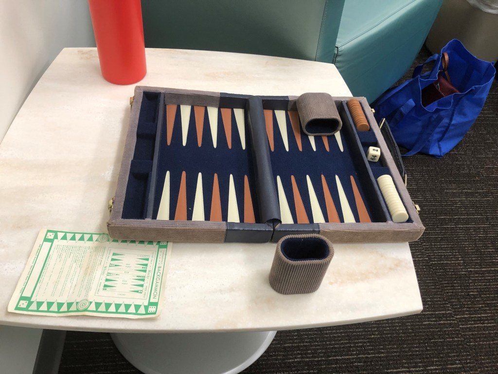 On Monday, the wait was over, and the doctors were ready to begin. Melissa was whisked off and I was told where to go to wait. A friend had already arrived and been shown to a private room to wait. When I arrived from upstairs, I was directed to the same consultation room. As we began to wait, she asked if I had ever played Backgammon. When I mentioned I had never played, she told me she had brought the game if I wanted to play. As the wait went on, I decided to give it a try. She had never taught anyone to play but had brought the rule book that came with the board. I read through the book, asked a few questions, and we began to play.