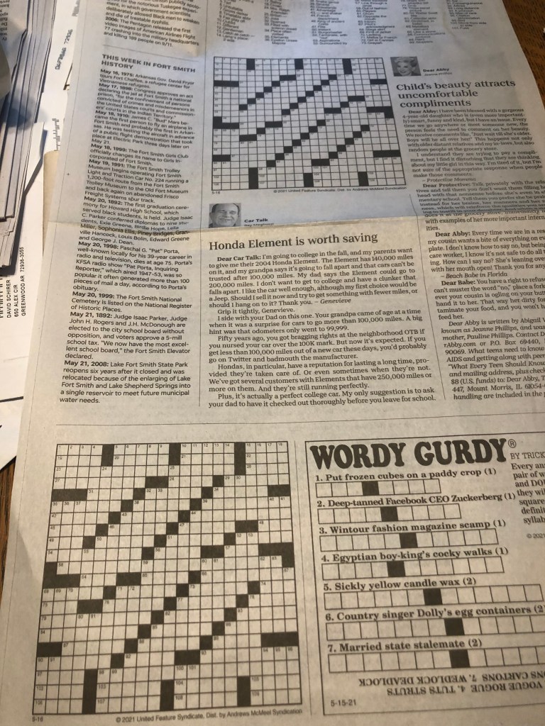 The Sunday paper has a bonus with additional crossword puzzles. One of these is from the New York Times. These are more difficult and often use words that I do not recognize even when I complete them. The crossword is on the top half of the page and the answers are on the bottom half. Melissa thinks I am cheating, but after wracking my brain as long as I can, I will flip the page to find the answer. My thought is this allows me to know the answers when they are repeated in another crossword. When I finally began work on last Sunday’s crossword, I flipped the page as usual to find the answer grid was blank, just like the puzzle itself. That meant there were not answers. I did not fill the crossword out.