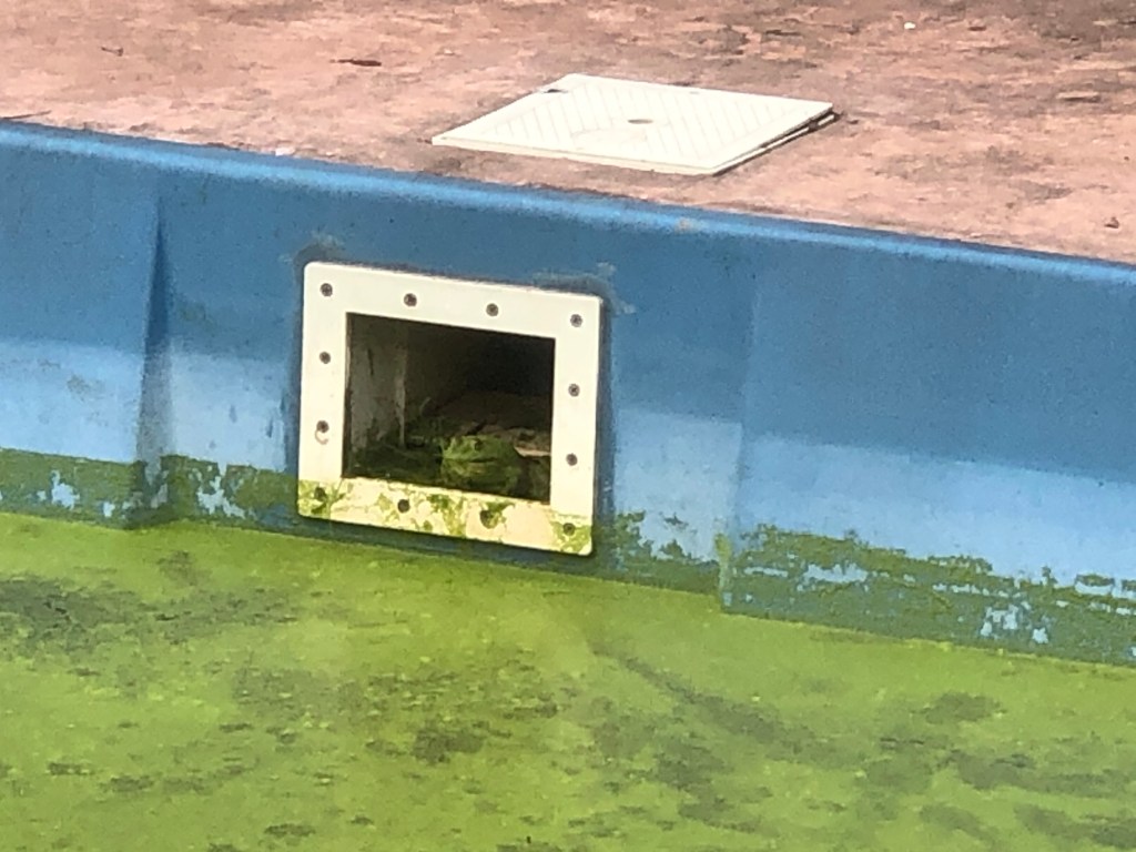 The green heron has been raiding my pool voraciously over the last several days. This has caused the tadpoles to scatter and the frogs to be wary. One of the large frogs has been out of the pool next to the steps, but even he does not go too far and sits staring at the bird. When I checked this morning, the heron was nowhere to be seen. I remember last year he only stayed around three or four days before moving on. Even then he would go back and forth from wherever he was staying. While he may be back later, the frogs have taken the opportunity to get out of the pool and get some rest. A big frog had decided to rest in the return vent, just two inches above the water line. A smaller frog was on the top step trying to jump onto the side of the pool. I watched as he made several attempts, barely missing the edge. He finally gave up and decided to rest on the step.