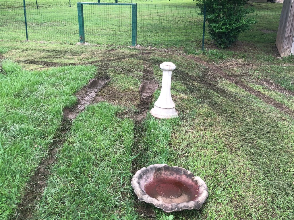 After picking up four loads of rose trimmings, I decided it was time to mow. I poured the last of the gas can into the mower and then needed to jump the mower battery to get it started. I took off along the back fence and immediately ran into trouble. There was standing water in the back strip and I could see skid marks from the neighbor’s mow earlier in the day. While he had decided against finishing, I decided to power ahead. I quickly mired down in the wet lawn and was unable to move forward or back. I needed to get my truck to pull the mower out of the muck (sound familiar?). Perhaps my lawn did not need to be as nice as my neighbors, even if my pride said it did.