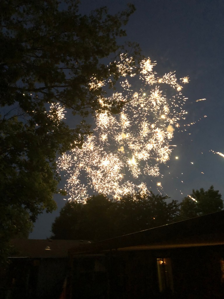 The fireworks display we watched last night were some of the most impressive we have seen in years. I am not fond of large crowds, and it is hard to go to community displays without encountering one. Instead, we stayed home. I tried to watch one of the national displays on TV, but it is not the same watching on a small screen without the noxious smell of gunpowder. That was when the sound of exploding shells began outside our house. When I walked out, you could just see the bursts over the top of the trees from the three different community displays near us. More impressive were the personal displays that began at the same time and lasted well into the night. These were not just roman candles and bottle rockets. They included all the chrysanthemum bursts, artillery shells, and crackles usually reserved for the community displays. They even appeared to have “Repeaters.” These preset boxes of are chain-fused fireworks that shoot a series of aerial shells, comets, or mines from collectively attached tubes to produce various colors, noises, and effects. I could not imagine what those might have cost.