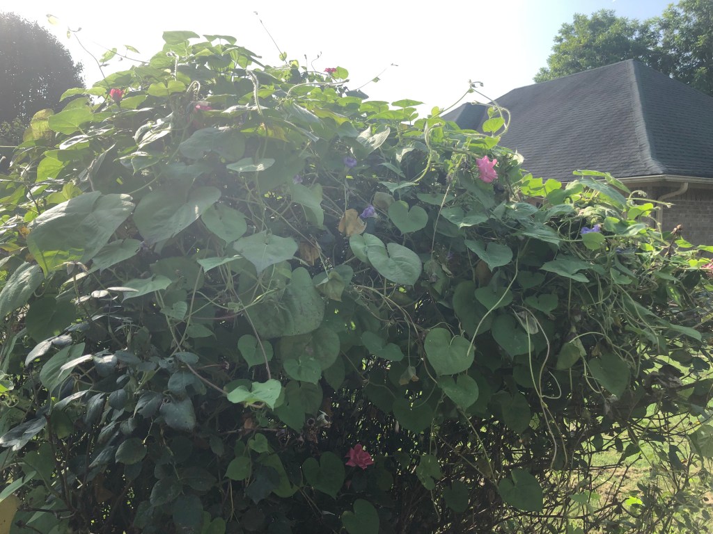 When I checked my rose bush last week, I noticed it had been completely enveloped in bindweed. I was surprised by how quickly it had overgrown my plant. I have seen the invasive effect of bindweed driving along the turnpike across Oklahoma. In some places it has completely covered the trees and fences on both sides of the highway. It appears I have two types of bindweed on my roses (lucky me!), as I have both pink flowers and bluish-purple flowers. I have marveled at the extent of the growth along the road and have wondered how long it had taken to be so widespread. If my rose bush was any indication, it did not take long.