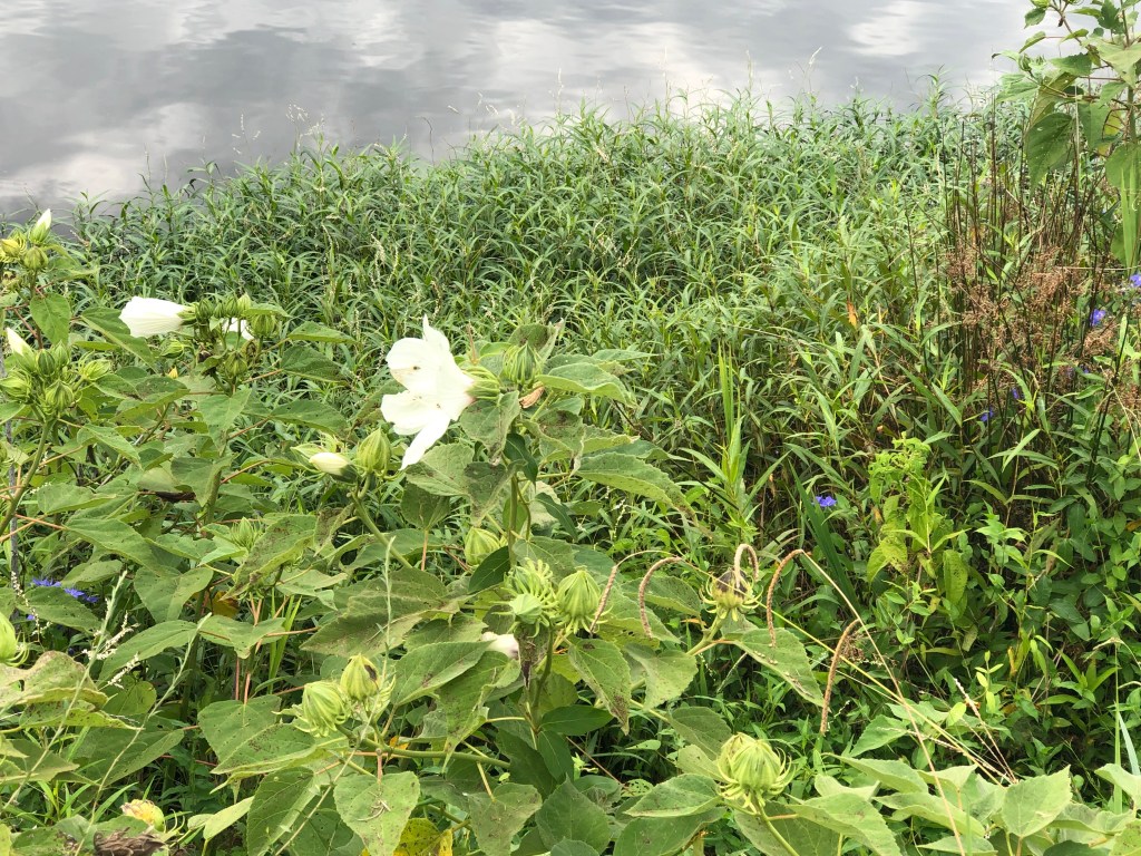 The lake I was fishing is a perfect setting for the Rose Mallow. The banks were in full sun and low along the water, meaning they were marshy. I was surprised to see 15 or more blooms and numerous pods in a 30-yard stretch along the lake. Last spring, State Parks had planted seedlings to help with erosion along the bank. I understand the logic for this, but they put the new trees in areas used by fisherpeople to get near the water. The combination of the new willowy bushes and the abundant grass and wildflowers now makes it difficult to fish. I guess if it was easy, it would not be a sport.