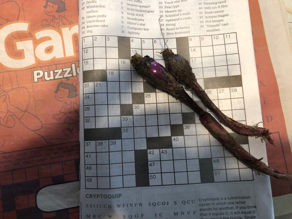 I have been wavering on whether to tear into the overgrown mess that began as my onion sets last June. Melissa had reminded me at that time that I had vowed (several times) to never grow onions again. My gardener friend had grown red onions last year and they were beautiful. I had tried yellow onions. Few sprouted and the ones that did, did not grow. Still, I succumbed to the alure of fresh onion completing the trifecta of onions, peppers, and tomatoes from my own garden that comprise salsa. I thought perhaps if I grew red onion this year the results would be different. I had let my cilantro go to head without harvesting, but if I could only get an onion this year . . .