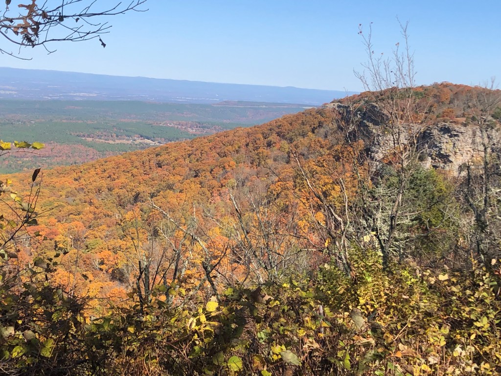 Since yesterday was a bank holiday (Veterans Day) we decided to take a drive up the mountains to see the fall colors among the leaves. Two different friends of Melissaโs who live in the mountains recently commented on how beautiful they were. We started our journey at an elevation around 450 feet (138.5 meters) and over the hour-long drive climbed to the top of Blue Mountain at an elevation of 2687 feet (819 meters). That meant while the leaves had not begun to turn in our area, they did as we climbed. Some areas at the top of the mountain had even dropped their leaves after the storms we have had this week. We ate lunch at a table overlooking the beautiful leaves that adorned the trees on the mountain slope below. We were glad we had made it to the leaves in time.