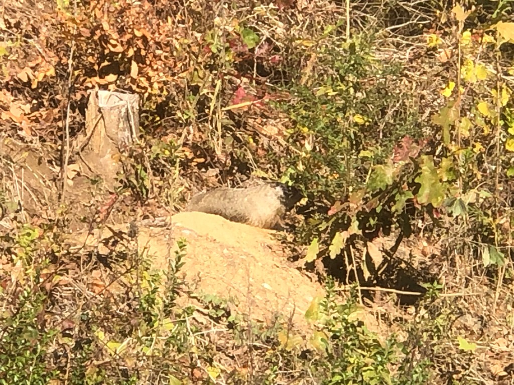 One of my ulterior motives for driving to see the leaves this week was because it is near the outlet tube I like to fish. The level of water coming out of the tube varies with the amount of rain and downstream needs, so I never know what to expect when I arrive. When we pulled into the reservoir the lake was up but not high. We took the winding two-mile road leading down to the tube. When I got out and checked the water was still down and there was only a small flow from the tube despite the rain we have received. I went back to the car, and Melissa and I were talking when I looked up and noticed a small brown animal crouched near the fence guarding the tube. I did not know what it was but as I studied the critter, I realized this was a groundhog.