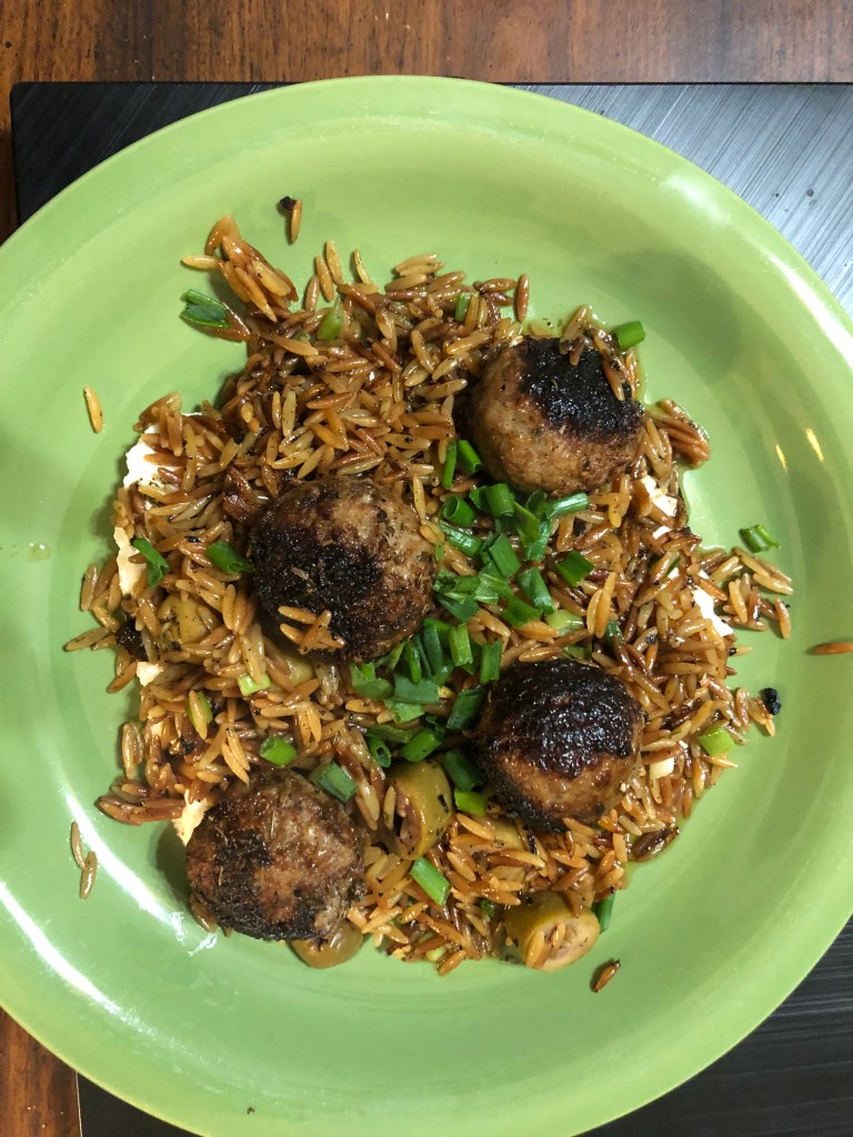 Now I was psyched to try the meatballs on Sunday. Rather than making our own, Melissa purchased fresh meatballs from the butcher (not frozen!). These were sprinkled with a variety of Greek spices and then browned in the skillet along with a thin sliced lemon. While this was happening, I chopped scallions and green Greek olives to use as garnish. Then I combined feta cheese, Greek yogurt, and olive oil into a soft paste in the processor. The next step was to remove the meatballs and lemons and cook the orzo in the same skillet, finally returning them to the orzo mixture with a little more lemon juice. A layer of feta paste was spread on the plate, the rice and meatball mixture layered over it, and then the olives and scallions as garnish. Another simple gourmet meal. I suggested to Melissa that she could make a return visit to her friend anytime she wanted.