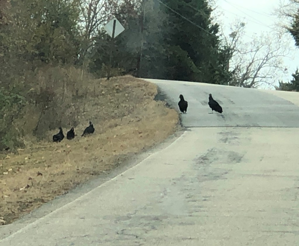 When I looked online, I found the Black Vulture (Coragyps atratus) is an abundant species of broad-winged scavenger in the southeast, although scarce in the southwestern US. In low flight, the vulture proceeds with several quick flaps followed by a flat-winged glide. When rising thermals provide good lift, it soars high above the ground. The birds are usually gathered in flocks. Although the shorter wings and tail make it appear smaller than the Turkey Vulture (Cathartes aura), the body size is about the same. Black vultures are also more aggressive and often drive Turkey Vultures away from food. During the day, Black Vultures soar in flocks, often gathered with Turkey Vultures and hawks. They roost in groups in trees and transmission towers, waiting through the early morning for the air to warm up and thermals to develop. Then once more they are gathered in the sky to soar the thermals.