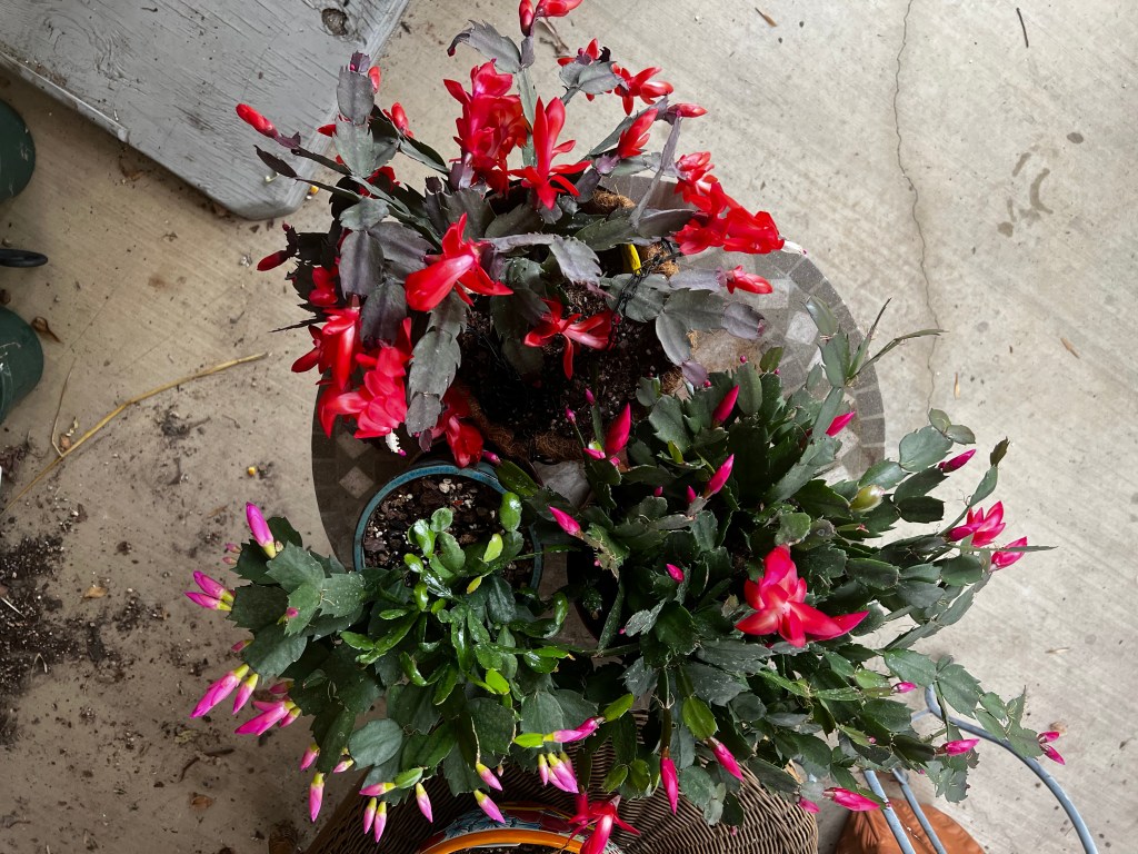 I have spoken several times about trying to nurture a Christmas Cactus without success. While I have given up, Melissa has picked up the gauntlet and began sustaining them as part of her succulents. She had several good blooms during the 2020 holiday, but a variety of maladies took several of the plants and then the cold got the stems of a few more. Still, Melissa was determined to try and resuscitate the plants. We had solo stems lying around the kitchen most of the early year trying to create epiphytic roots (air roots). When these sprouted, the stems were transplanted into small pots, and as the stems grew, they were moved into larger pots. This fall they were strong enough to be transferred into larger hanging pots and they are on the back porch greenhouse. Now that the holiday is again upon us, they have decided to burst into blooms.