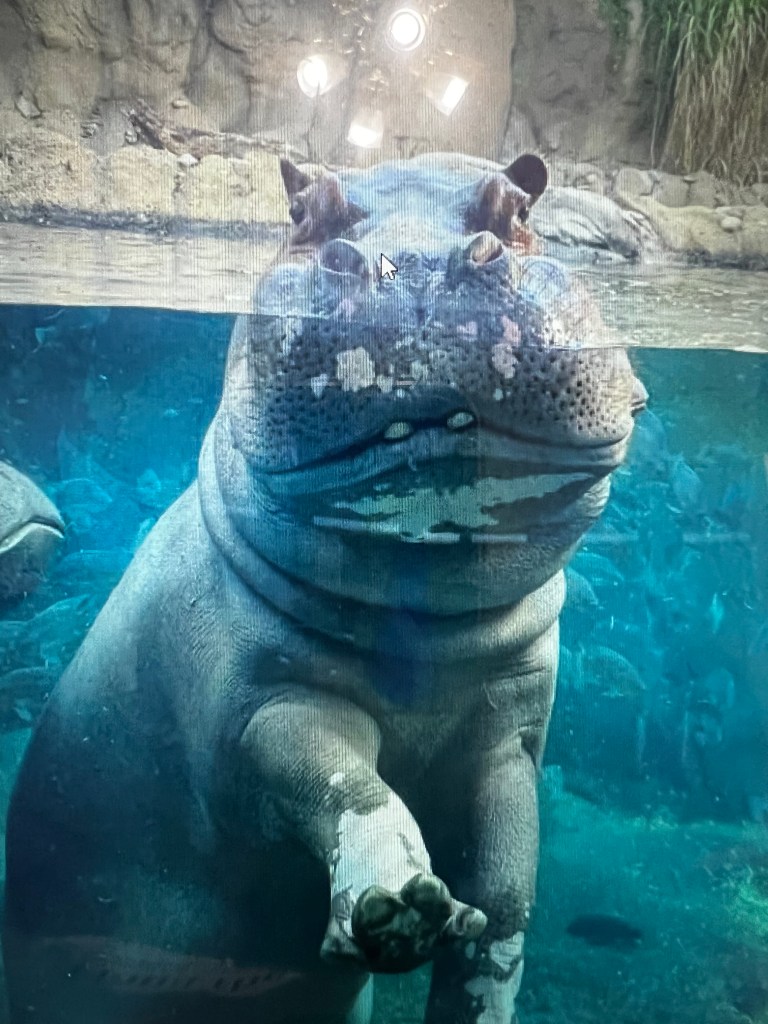 When I looked online, I found the hippopotamus (Hippopotamus amphibius), also called the hippo, common hippopotamus, or river hippopotamus, is a large, mostly herbivorous, semiaquatic mammal and ungulate native to sub-Saharan Africa. It is one of only two extant species in the Hippopotamidae family, the other being the pygmy hippopotamus (Choeropsis liberiensis or Hexaprotodon liberiensis). The name comes from the ancient Greek for “river horse”. The hippopotamus is the third-largest land mammal, after the elephant and rhinoceros. Despite their physical resemblance to pigs the closest living relatives are cetaceans (whales, dolphins, porpoises), from which they diverged about 55 million years ago. Hippos are recognizable by their barrel-shaped torsos, wide-opening mouths revealing large canine tusks, nearly hairless bodies, columnar legs, and large size. Adults average 3,310 lb (1,500 kg) for males and 2,870 lb (1,300 kg) for females. Despite the stocky shape and short legs, hippos can run 19 mph (30 km/h) over short distances. Fiona is still small, weighing in at 1800 pounds (816.5 kg).
