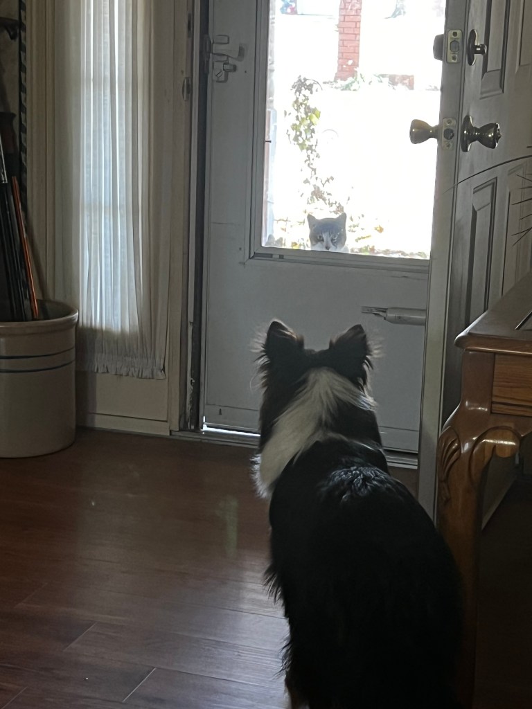 Eddie was not the only animal with curiosity today. The white cat who lives across the street has become a daily visitor since I installed the bird feeders in the back but has never approached the house. When Eddie arrived, I noticed her watching. She must have been wondering about this new dog running around in our yard. Not long after arrival, we looked up to see the cat peering through the screen door into our house. When Eddie saw the cat, he took a few steps toward her and then the two had a stare off in the hall. After staring at each other for a minute Eddie gave one bark and the cat took off.