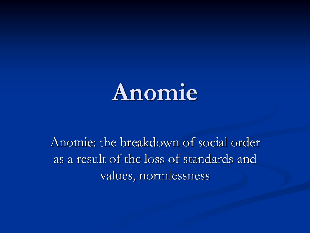 When I went online, I found Anomie is a social condition defined by a breakdown of moral values, standards, or guidance for individuals to follow. Anomie was thought to evolve from a conflict of belief systems and causes a breakdown of social bonds between an individual and the community. Personal alienation can progress into an inability to integrate with normal situations of the social world, like finding a job or a successful relationship. Durkheim used anomie to refer to the effects of industrialization in Europe. The contemporary understanding of anomie accepts greater flexibility in the “norm”, and some have used the idea of normlessness to reflect a situation like the idea of anarchy. However, for Durkheim and later theorists’ anomie is a reaction against the social controls of society, while anarchy is a state of disorder due to absence or rejection of authority or other controlling systems.
