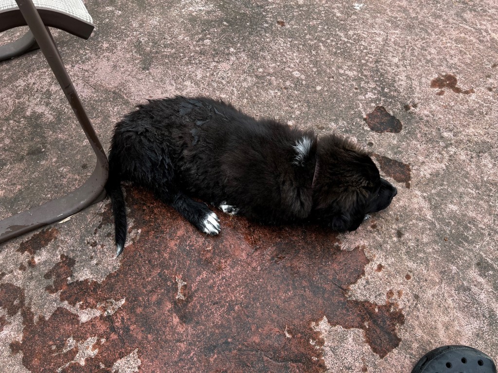 I was lying in bed this morning when I received a text from Melissa asking me to come watch the dog. Melissa was on a zoom call for work and Zena was frolicking on the deck around the pool. Even though we have a tarp covering the pool, the recent rains have sagged the tarp about two and a half feet (3/4 meter) and there is about six inches (15cm) of water standing in various places on top of the tarp. I have seen Zena frolic around the pool every time I have taken her out on the deck. She bounces around like any puppy and gets too close to the edge. I have also seen her fall into the pool, but the cover and the step where she has fallen have given her enough traction to allow her to climb out before I could get to her to help. I went outside to appease Melissa’s fear of, “just in case.”