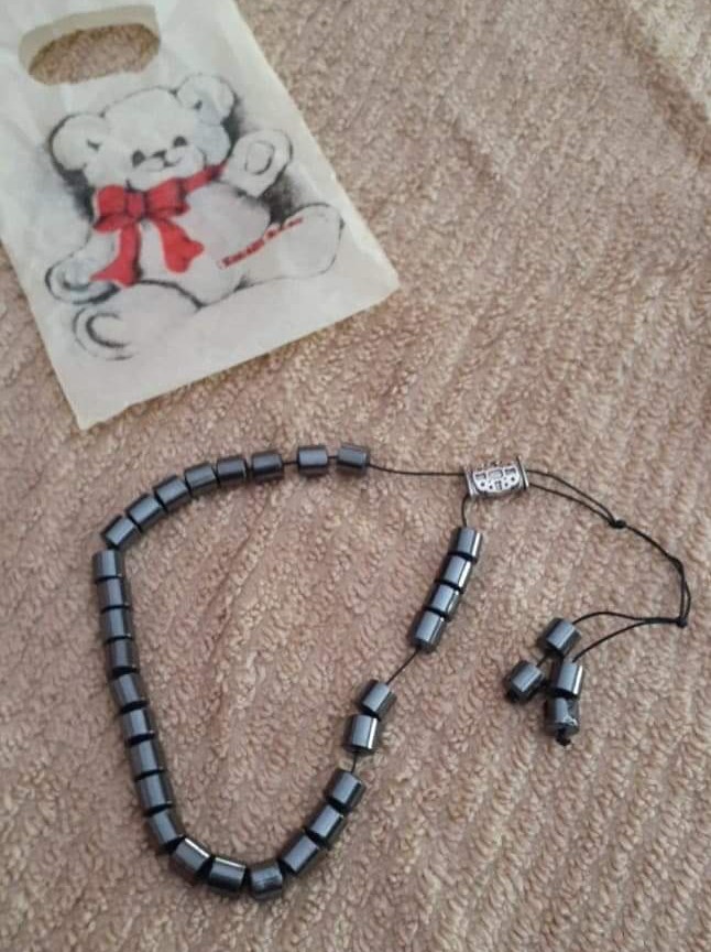 When I looked online, I found Greek Worry Beads (kombolói) are a string of beads meant to be manipulated with your hands that are used to pass time in Greek and Cypriot culture. Unlike the prayer beads used in religious traditions, worry beads have no religious or ceremonial purpose. Worry beads may be made from any type of bead, although amber, amber resin, and coral are preferred as they are thought to be more pleasant to handle than beads made from non-organic metal or minerals. Worry beads have several uses in Greek culture. They may be used as an amulet to guard against bad luck, to quit smoking, or to simply pass the time. The beads usually have an odd number, which is often a multiple of four plus one bead, or a prime number. A fixed bead and a shield serve as the head to separate the two threads and help the beads flow freely. The beads end in a tassel about two palm lengths long. This is what she had.