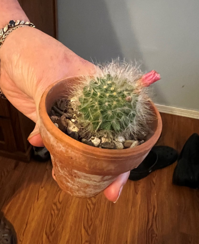 When I looked online, I found the Parodia penicillata is usually a small growing, solitary cactus native to northern Argentina. The pale green to bright green stem begins globose (spherical) and grows into a tall columnar (cylindrical) cactus. The cactus may grow up to 18-20 inches (40-50 cm) tall and 3 ½ inches (9 cm) wide. The spines are generally a glassy, bristly straw-color but may be pale yellow, or pale brown, and become dense on the plant. The radial spines are thin and silky, while the central spines are longer, stiffer, and more colorful. Funnel-shaped flowers bloom in summer in either orange-yellow or brilliant red, that form into a pointed (apical) circle. The dried flowers will remain on the plant body for a long time after blooming.
