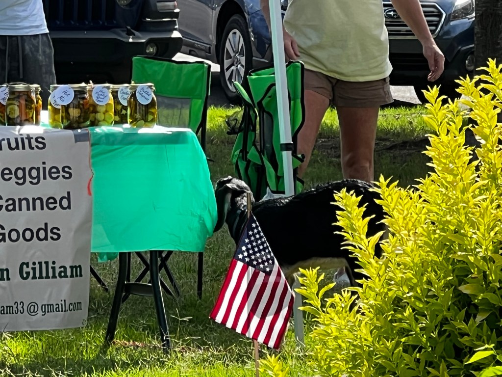 I was surprised when I noticed one of the farm venders walking what I thought was an ugly, skinny dog to their booth. What I noticed first was that the animal walked with a limp and needed to be helped around. Initially, the vender put the pet in one of the camp chairs they had brought to sit in. It turned out the animal was quite agile as it was all over the three chairs, walking back and forth across them as they were lined in a row. After they finished setting up, they put the animal on a leash and set it down in front of their tent. When I took a good look, I realized it was not a skinny dog at all. It was a goat. The goat began to do what goats do and ate the grass in front of their booth. While several children stopped to pet the goat, most paid it no mind. Apparently, the goat became bored because when I looked over, it was eating the plastic tablecloth. Again, that is what goats do.