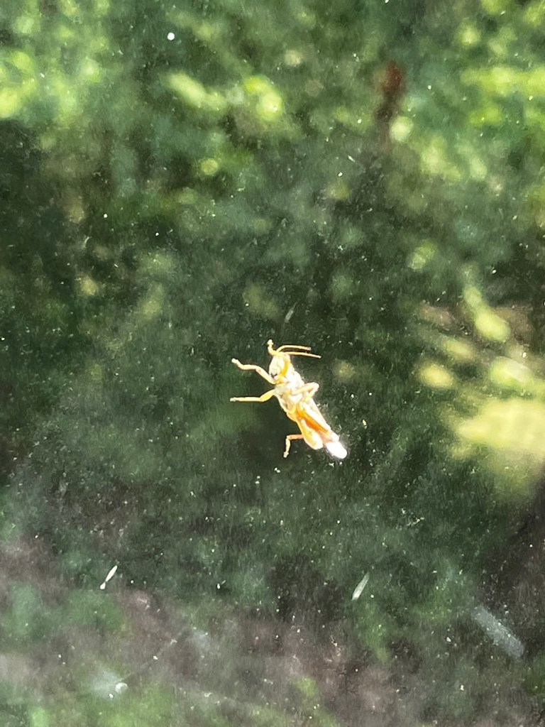 I made a quick run to the market yesterday and when I got back to the car, I noticed a grasshopper hanging onto the outside of the passenger side window. This is hardly a rarity and I paid it no mind as I sped off for home. When I got up to speed, I glanced over and even though the wind was blowing the hopper to one side, it was still clinging tenaciously to the glass. The hopper held on for half a mile (0.8 km) as I drove through town. It was not until I stopped to turn that the hopper finally jumped off the glass. While I could not blow him off in the wind, I guess he decided the free ride was over.