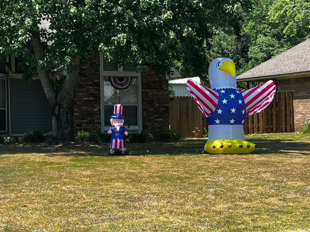While Zena and I were walking our neighborhood I was surprised by the number of yards decorated for Fourth of July. Our subdivision has always had proliferations of displays for Halloween and Christmas, and even a few displays for Thanksgiving. We also have quite a few houses which fly American flags on holidays and special occasions. Even permanent flag displays and flag poles have become more prevalent over the last several years. However, this is the first year I have noticed the yard displays for the Fourth. Most of these displays are small and consist of small flags lining the walls or driveways, but one house went all out. The display had 3 foot (1 m) high blowup letters spelling freedom along the walkway to the house, a 40 inch (1 m) inflatable Uncle Sam, and a 7 foot (2 m) inflatable bald eagle with red and white stripped wings and a blue vest full of stars. This was accompanied by the flags and flag bunting around the yard and windows-white-and blue wings set with stars. I am sure many of these same yards will contribute to the neighborhood fireworks demonstrations that mark the day in our community.