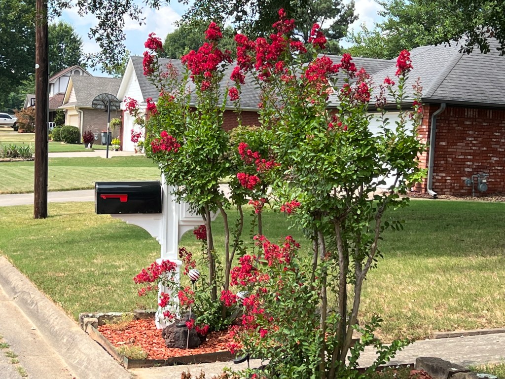 When I looked online for crepe myrtle (Lagerstroemia var.), I found it is a genus of around 50 species of deciduous and evergreen trees and shrubs native to the Indian subcontinent, southeast Asia, northern Australia, and other parts of Oceania, that has then been cultivated in warmer climates around the world. It is a member of the family Lythraceae, which is also known as the loosestrife family. The genus is named after Swedish merchant Magnus von Lagerström, a director of the Swedish East India Company, who supplied Carl Linnaeus with plants he collected. These flowering trees are beautifully colored and are often planted both privately and commercially as ornamentals. All varieties grow best in full sun. The Red Rocket (Lagerstroemia indica ‘Whit IV’) variety of crepe myrtle appeared to be what we saw in the neighborhood mailbox planter.