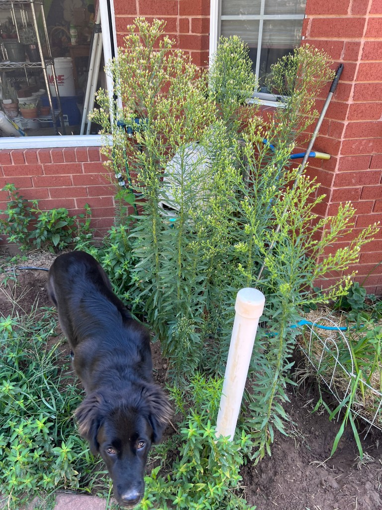 I thought it appropriate since I wrote on pigweed yesterday that I follow up with horseweed today. I mentioned while I have placed a small fence around the areas where I grow vegetables, I allowed Zena access to two small areas of ground to run and play. The larger area had been planted with the ground cover and the naked ladies (Amaryllis belladonna) I have written about. The area next to the faucet had been used effectively for potatoes last year, but with Zena this has become the preferred digging area. Her excavation has become intense, and I knew it was time to cut down some of the taller weeds and fill the holes back in with the soil she had piled on the cement pavers. I was surprised to see how tall the weeds had grown, and when I googled, they were identified as horseweed.