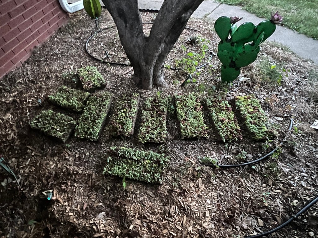 Melissa has planted a variety of sedum in the front beds we are trying to turn over to the succulents. I wrote in May how the pink stonecrop (Sedum ewersii) in the front driveway bed had begun to flourish even while others have not survived the winters. We had replaced the mulch in the front beds with pea gravel as it provides good drainage for the succulents, but the gravel does not do much to keep out the weeds. Melissa has been holding back on buying additional succulents until she gets her business off and running, so I was surprised several weeks ago when two large boxes (back-to-back days) showed up at the front door. I was told these were not business succulents, they were housing succulents. These sedum carpet tiles had been purchased from a grower friend to start ground cover and keep down the weeds.