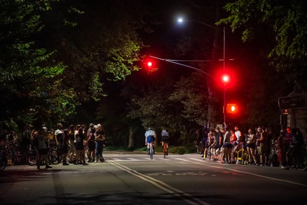 When I looked online, I found Chris Salucci and Stevie Valentine founded the Central Park Raccoons several years ago after a summertime “alleycat”, an illegal bicycle scavenger hunt to crown the city’s best bike courier. The rise of electric delivery bikes has sent the messengers into decline and the alleycats have become less frequent. Messengers have long favored fixed-gear bikes because their lack of moving parts made them more durable on city streets and easier to repair. The bikes only have one gear and if the bicycle is moving, the pedals are in motion. Brakes are famously optional. Before the pandemic, Salucci and Valentine held regular training sessions in Central Park doing hill repeats, known as the Not So Friendly laps. When those sessions grew too big for the duo to handle, the Shootouts were born. It is usually the more traditional road cyclists and fixed-gear racers who move on in the Shootouts races.