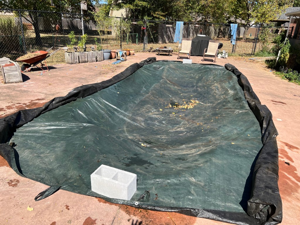 It is just under one year since I wrote about our decision to place the cover over the pool in our back yard. While this had been a request from our lender, I figured it was not a bad idea. The cover is designed to keep the leaves out (which are again starting to fall) and serve as a deterrent to people inadvertently walking into the open pool (pay attention!). After some initial delays (supply chain, not my problem) we were able to get the cover and the water bags that hold it in place on the pool. This worked well although I needed to buy a sump pump to keep the rainwater from filling the cover and pulling it into the pool. That was until the arrival of Zena. The covered pool became an instant attraction to our puppy, and she would jump into the pool to swim. She later began to attack the orange caps on the blue water bags (she loves plastic). I pulled the tarp out of the pool last week to let it dry and today was determined to re-cover the pool in a way Zena could not compromise.