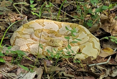 The Nation & World page of my local newspaper carried a USA Today article about a white rattlesnake on display at the Natural Science Museum in Jackson, Mississippi. This is one of the rarest rattlesnakes most people will ever see. Jamie Merrill, conservation associate biologist with the museum, said the snake has a genetic condition called T-positive, which is a reduction of pigment and not a total loss of pigment. He is off-white with tan chevrons. T-negative would be a total loss of pigment, which is a little rarer than T-negatives. Herpetologist Terry Vandeventer of Jackson said the fact this rattlesnake survived to adulthood is so rare it cannot be calculated. One out of several thousand timber rattlesnakes are born T-positive. The odds of a normal juvenile rattllesnake living to adulthood in the wild are already low, but a T-positive snake not having camouflage to protect it from predators make the odds of survival considerably lower. This snake survived to adulthood, was captured, and was relocated to the museum where it is now on display.
