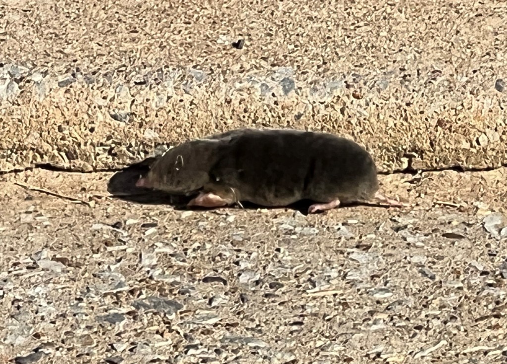 When Zena and I went out for our walk this morning we encountered a mole shuffling along the road gutter near our house. While I my yards always seem to provide evidence of mole presence, this is the first mole I have ever seen above ground. Zena is always curious about new encounters and immediately wanted to find out what this tiny intruder was in our walk environment. Since my yard has been plagued by a mole (s?) my first thought was to get rid of it. Then I remembered how the benefits of a mole (removing insects, grubs, and worms) are said to outweigh the runs and exit holes they leave in your yard. I have an aversion to killing anything for no reason other than it is there, and rather than kill them I use sonic stakes to repel moles from my yard. I diverted Zena’s attention with a treat, and we went on down the street. My thought was it is too far to make it to my yard anyway.