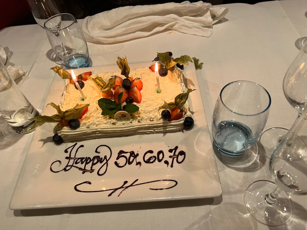 We got some much needed rest until the second excursion was announced. I languished in my preparations and did not get outside for the bus until after the scheduled departure. By the time I arrived, the bus was gone. That was when I learned the first rule of cruising, the departure time is the departure time, not one minute later (or five as the case may be). Everyone from our cohort arrived safely and we embarked right on time (again, rule one). I was looking forward to the meal as Melissa and I had both planned a surprise. We have had a tradition began by my sister-in-law of having celebratory tee shirts to mark the occasions when we get together. Although we were not all here, there were 10 of our extended clan who had made the trip. The shirts were passed out and we wore them to the dinner. I had planned another acknowledgement with the cruise line to also mark the occasion. As the meal drew to an end, I asked the maître de what was coming, only to find he had not been informed. He quickly put together a cake and champagne for a family toast. When Mellissa and I returned to our room we found a bottle of champagne and two congratulatory cards to mark the occasion. A miss communication, but I guess we can use this to celebrate another night.