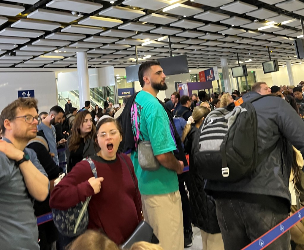 Yesterday marked the end of Melissa’s and my “time on the continent”, and we prepared for another long travel day.  This began as the 4 of us caught an early shuttle for the airport in Paris.  The driver dropped us off at the terminal, but nowhere either of our 2 groups had to check in.  Since we were on our way home, Melissa and I opted to check our carryon bags thinking it would be less hassle.  While we waited for an assist to the gate, my sister approached.  Their airline had canceled their flight and it would be 6 hours before they could catch another.  We sat talking waiting for our assist as the time for boarding drew near.  When he finally arrived, we said our goodbyes and headed for the gates.  It seemed the more I took off at security the more they wanted me to remove.  Then we were through the checks on off to the gate, arriving just prior to boarding.  It was a good thing we had allotted 4 hours to get on the plane.