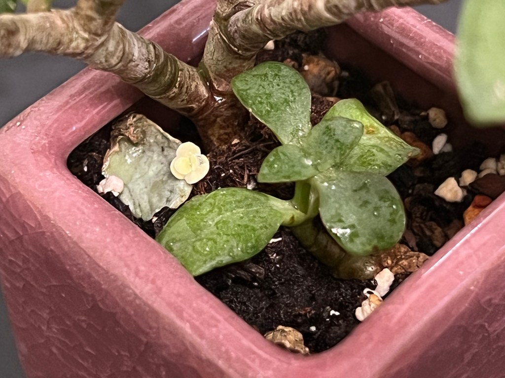 Prior to taking our trip Melissa had taken painstaking care to lightly water the succulents that were coming out of dormancy as they prepared for winter. She has been cultivating many of these plants for the last two years and there has been little activity from most of them. When we returned after three weeks, Melissa was surprised to see how many of these succulents had begun to flower while we were away. This once more proved the adage, “The best thing you can do for your succulents is to leave them alone.” The plant I found most interesting was the ripple jade. A tiny (1/3 inch/0.85 cm) white flower had sprouted on what I thought was a dead leaf.