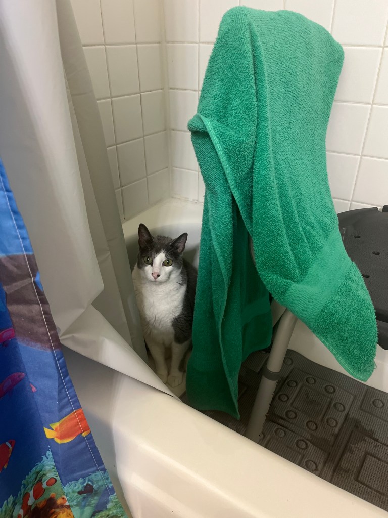 I have mentioned how my response to bad weather tends to be to go outside and watch. A storm rolling across the unbroken prairie was one of the things I missed when I moved from Kansas, and something I looked forward to seeing when I visited. I always found the power of a thunderstorm exhilarating. I also tend to look outside during a tornado siren to see what is happening (kids, do not do this at home!) even though we are warned to “shelter in place”. When the sirens went off several weeks ago, I did what I usually do and went out to the back patio. Zena was a little skittish at first as this was her first experience with a bad storm but seemed to settle down once she saw my reaction. Later, my niece visited and when I mentioned this, she showed me a picture of her cat during the storm. Chandler had paid attention to the forecasters and crawled into the bathtub in an interior room like he was supposed to do.