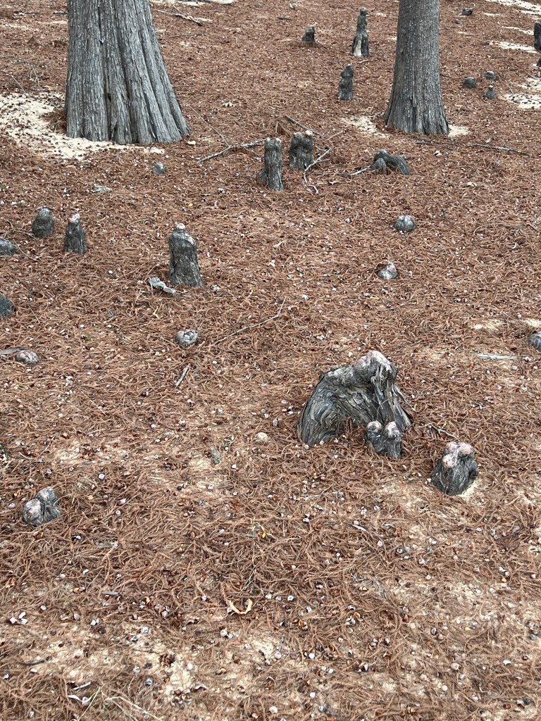 When I looked online, I found these knees are not exclusive to the Bald Cypress (Taxodium distichum). This distinctive structure forms above the roots of various species of the subfamily Taxodioideae, of which the bald cypress is one. Their function is unknown, but they are generally seen on trees growing in swamps. Current hypotheses state they might help to aerate the tree’s roots, create a barrier to catch sediment and reduce erosion, assist in anchoring the tree in the soft and muddy soil, or any combination of these. The knees are woody projections sent above the normal water level, roughly vertically from the roots, with a near-right-angle bend taking them vertically upward through the water. One early assumption of their function was that they provided oxygen to the roots that grow in the low dissolved oxygen (DO) waters typical of a swamp. This was thought to act as a specialized respiratory root in certain aquatic plants that grows upward and protrudes above the water or mud into the air (pneumatophores). Mangroves (Avicennia marina) are another tree with a similar adaptation.