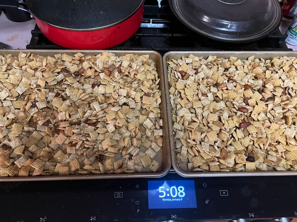We are getting ready for the Championship game of the 2022 college football season which airs tonight. I had not thought much about the game until Melissa asked if we were going to have snacks for supper. I have mentioned snacks and sides are our go to meal for most of the big games (and often holidays) we celebrate. Since Melissa is working and on a day long Zoom call, that meant I needed to see what we had available, and what else I might want to prepare to get ready for the game. When I looked in the pantry, there was not much. I noticed we did have leftover boxes of cereal, nuts, and the spices I used to make Chex Mix. I poured them all together in a large bowl and added the seasonings. As I mixed it together and put it in the oven, I realized this was probably the last time I will make this snack until the next Christmas season.