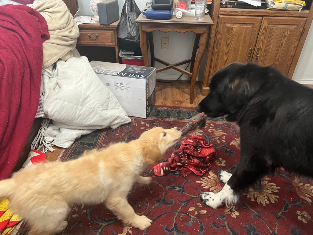 When I arrived home last night I found Melissa sitting in my chair with a strange dog in her lap. I was taken back as Melissa said, “Say Hi to Zena’s little brother!” I assumed this was a friend’s dog who we had been asked to puppy sit. We had talked about the possibility of getting a second dog to keep Zena company and had gone back and forth over the extra work and the need to expand the fenced portion of our back yard. When we took Zena to meet the two year old Pyrenees female we were considering they were not compatible, and I thought this was the end of the conversation. I was apparently wrong. The 12 week old Golden Retriever sitting in Melissa’s lap was our new addition. My first thought was this puppy may have been designed to serve as my penance during Lent as it will take about that long to house train him. We named him Loki, for the Norse trickster god.