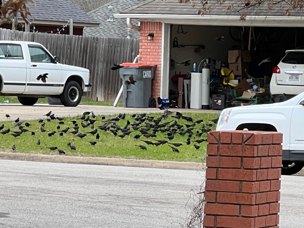 When I recorded the birds for the Great Backyard Bird Count (GBBC) I mentioned how one day I had seen a large flock of Northern Grackle’s (Quiscalus quiscula). I rarely see this flocking behavior around our house, except in winter or early spring. Melissa and I saw 1,000’s of Redwing Blackbirds (Agelaius phoeniceus) flocking together when we visited the wildlife preserve in the fall. Later in the week Melissa called me to come see as the birds were flocking again, except this time it was in our front yard. I quietly stepped onto the front porch to get a photo and they all took off together. They did not go far and landed across the street in the neighbor’s yard. Apparently, I was not too much of a threat.