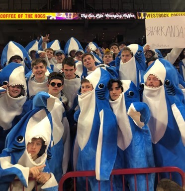 In the lead story of the sports section of my local newspaper Christina Long reported on the origin of Sharkansas by the Razorback student section at basketball games. The recent tradition of hundreds of Arkansas students clad in bright blue shark costumes has drawn both annoyance and adoration of fans. This now typically happens when the Hogs play Kentucky at home. Some fans believe the blue shark costumes are too close to the color of blue worn by Kentucky. Others say the sharks remind them of the attempt by Ole Miss’ to switch from Colonel Reb to adopt the animal as its mascot. Regardless, Sharkansas has persisted and is predicted to again make an appearance when the Hogs host the Wildcats for the last regular season basketball game this Saturday.