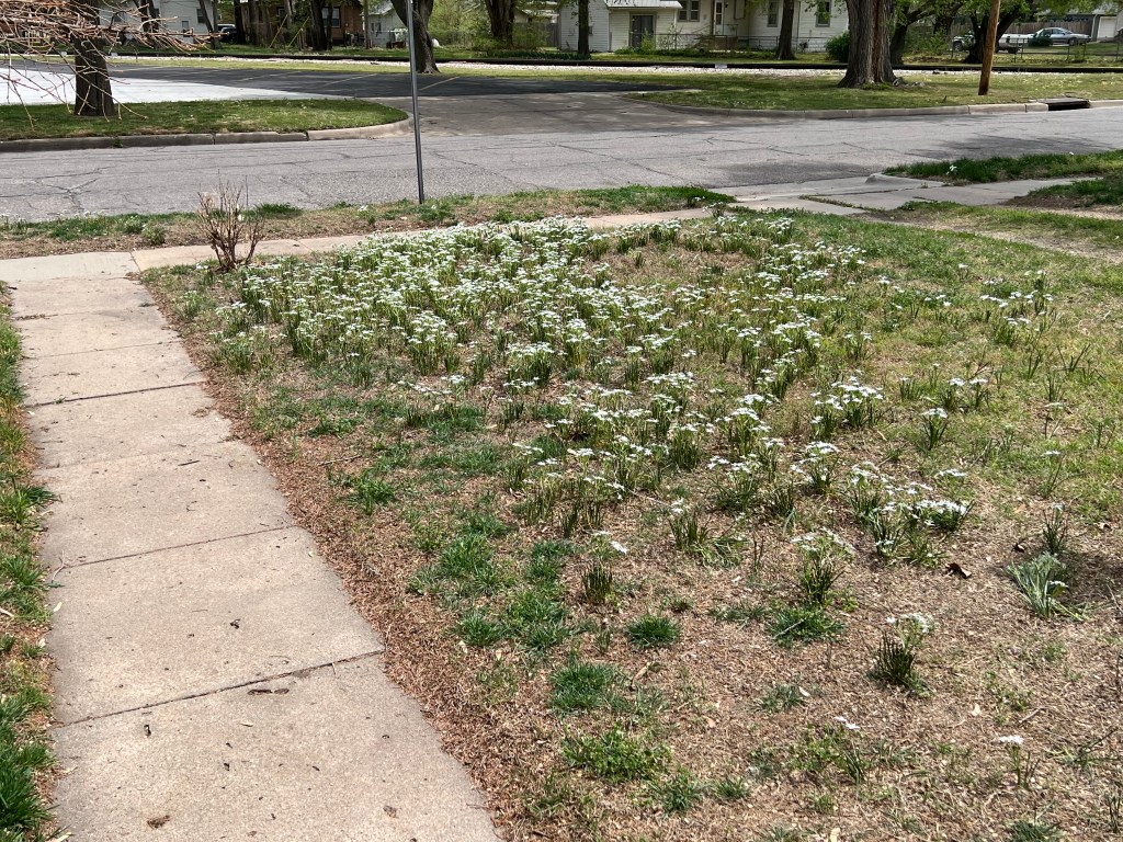 After the Star of Bethlehem flowers finish blooming, the plant looks like a mass of tangled foliage and is not particularly attractive. However, as long as the clump stays green it continues to feed the bulbs through photosynthesis. Eventually the leaves turn brown, and the plant goes dormant during the summer. This leaves gaps in the flower bed and people often remove the dead foliage. Many gardeners plug these gaps with annual plants, while others grow perennials next to the Star of Bethlehem plants that fill in the space as summer progresses. Deadheading the spent flowers does not prompt additional blooming, but it does limit the spread of the plant by eliminating the seeds that quickly volunteer new plants wherever they fall. The bulbs also multiply prolifically, producing what are referred to as offsets or bulbils. In many states, this plant earns a severe “Do Not Plant” warning against invasiveness, and you are advised to check with local experts before planting Star of Bethlehem in your garden. I do not know if the species was planted by someone in this historic neighborhood, but it has taken hold of this and every front yard on the block. They are no doubt removed by the residents with the first mowing.
