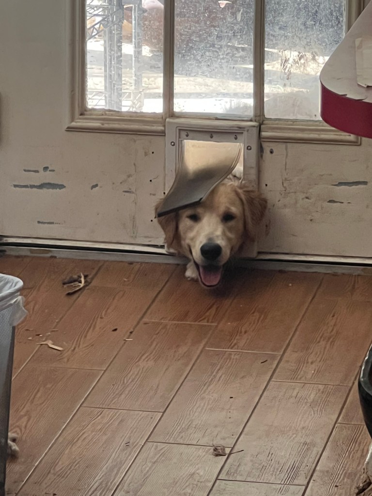 Melissa called me over last week to see the new habit Loki has learned when he wants to get back inside the house. When Melissa originally lived in the house, she shared it with four cats and a small dog (and parents). The door leading outside from the kitchen had a small door with a vinal flap that allowed the cats to come in or go outside whenever they wanted. The cats did not make the move with Melissa to Kansas and were gone by the time we returned 10 years later. Our sheltie was too big for the door and Bella never tried to squeeze through the small hole. When we acquired Zena, she was too large for the hole as a small puppy, and now at 80 pounds has never attempted to squeeze through. Although Loki is also too big to use this as an access, that does not keep him from sticking his head and front paws through the door to make sure we know he wants inside.