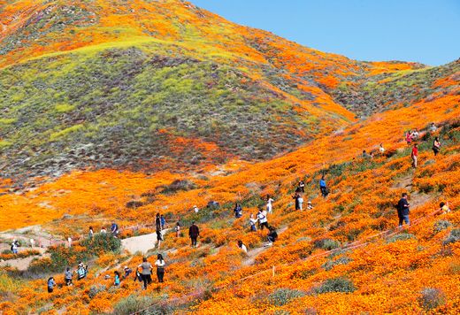 In the Mojave Desert of California, common plant species and their colors composing the superbloom are brittlebush (Encelia farinose – yellow), California poppies (Eschscholzia californica – bright orange), bluebells (Phacelia campanularia – deep purple), lupine (Lupinus albus – purple), sand verbena (Abronia villosa – yellow), desert sunflowers (Geraea canescens – bright yellow), evening primrose (Camissonia brevipes – mostly white but occasionally yellow), popcorn flowers (Plagiobothrys rufescens – white or yellow), and desert lily (Hesperocallis undulata – white). Invasive plants also include the wild mustard, and particularly the black mustard that has invaded the hills around Los Angeles. After a unique series of winter storms, outdoor enthusiasts are expecting an unprecedented abundance of flowers this year. Daniel Winkler, a research ecologist with the US Geological Survey said there is no scientific definition for what constitutes a superbloom. “The superbloom is really a cultural phenomenon, where people decide that there are enough flowers here, right now, that we’ll call it a superbloom.” Winkler said.