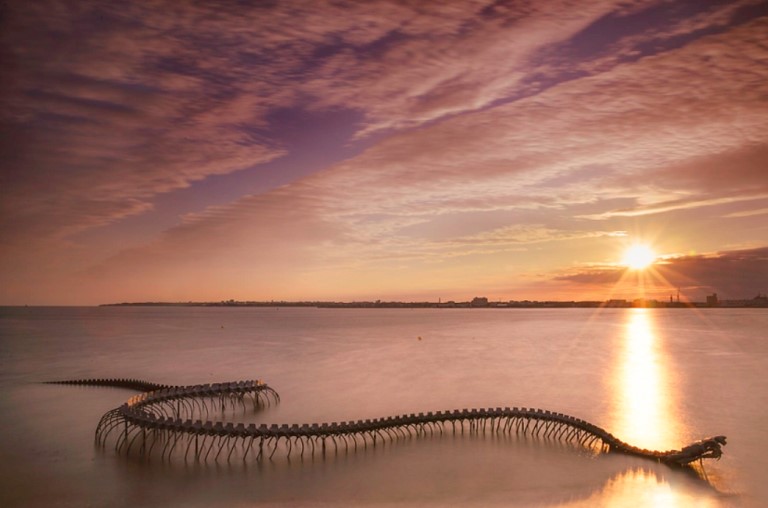 Last Saturday I found a link on Tiffy Taffy to the giant ‘serpent’ that emerges from the sea off the coast of France. This is a 425-foot (129.5 m) sculpture that is repeatedly hidden and revealed by the tides every day in the Loire Estuary. The serpent is located along the Loire estuary and is part of a permanent public art collection that spans the 37-mile-long shore. Made of aluminum, the giant serpent emerges from the water when the tide rolls out as if the ocean is revealing an ancient fossil. The piece was created in 2012 by the French-Chinese contemporary artist Huang Yong Ping and is called Serpent d’océan. Huang created the giant serpent to mimic the nearby Saint Nazaire bridge to blend the piece with the rest of the landscape.