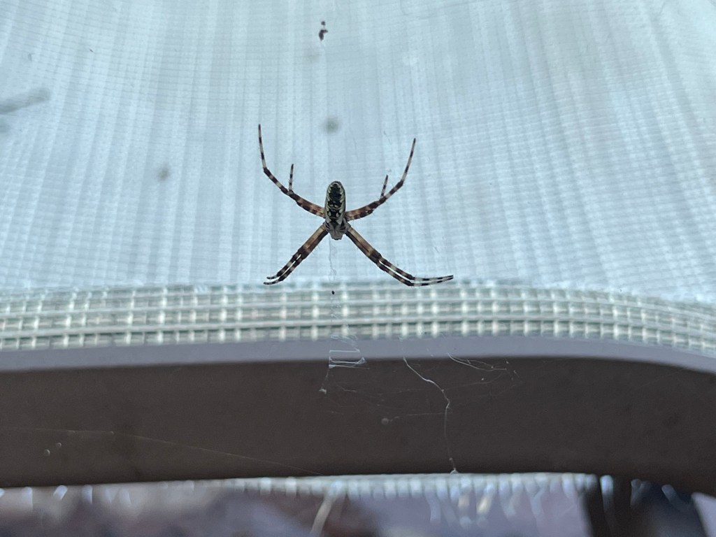When I went online, I found the yellow garden spider (Argiope aurantia), also known as the black and yellow garden spider, is common to the contiguous US, Hawaii, southern Canada, Mexico, and Central America. It has distinctive yellow and black markings (hence the name) on the abdomen and a mostly white cephalothorax. Its scientific name translates to “gilded silver-face” (Argiope means “silver-face”, aurantia means “gilded”). The body length of the male ranges from 0.20 to 0.35 inches (5 to 9 mm), while the larger females range from 0.75 to 1.10 inches (19–28 mm). The spiders may bite if disturbed or harassed, but the venom is harmless to non-allergic humans, roughly equivalent to a bumblebee sting in intensity. Yellow garden spiders are orb-weavers and prefer to build their webs in areas adjacent to open sunny fields where they stay concealed and protected from the wind. They can also be found along the eaves of houses and outbuildings or in any tall vegetation where they can securely stretch a web. Female yellow garden spiders tend to be somewhat local, often staying in one place throughout much of their lifetime. The large size of my yellow spider indicated this must have been a female.