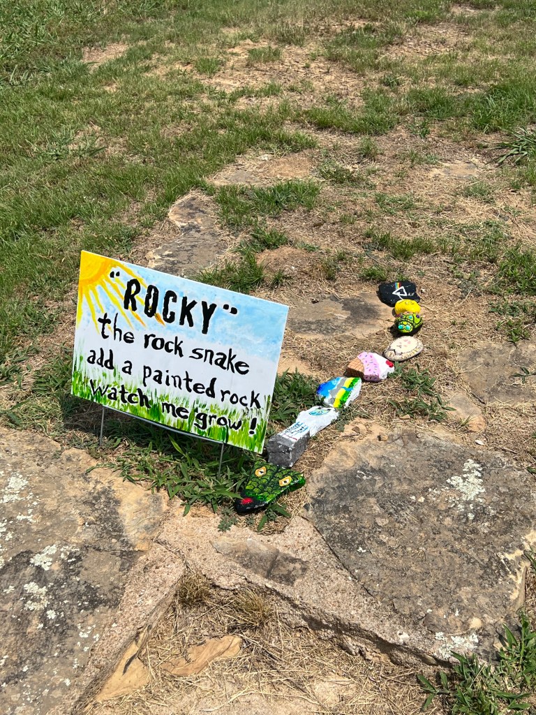Melissa and I decided to take a drive last week after taking the dogs for a walk. The dog park is close to a small park and fishing lake where I often try my luck. This is one of the community fishing lakes that Arkansas Game and Fish stock with catfish in the summer and trout during the winter. It also has a 1.2 mile (1.9 km) walking trail that winds around the lake. As we entered the park, I noticed a brightly painted sign at the side of the road but did not pay much attention. We went to the lake so I could check my fishing spots. There were several people fishing, but the spots I frequent were all open. I keep my poles in the back of the car “just in case” but because of the heat decided not to stop. As we drove out of the park the bright sign again caught my eye, and this time I stopped. Laying on the group, ground next to the sign was a line of painted rocks with the lead rock painted like the head of a snake. The sign said, “Rocky” the rock snake add a painted rock and watch me grow!”